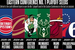 近6年东部第一由6支不同队轮换:76人/热火/雄鹿/绿军/骑士/活塞